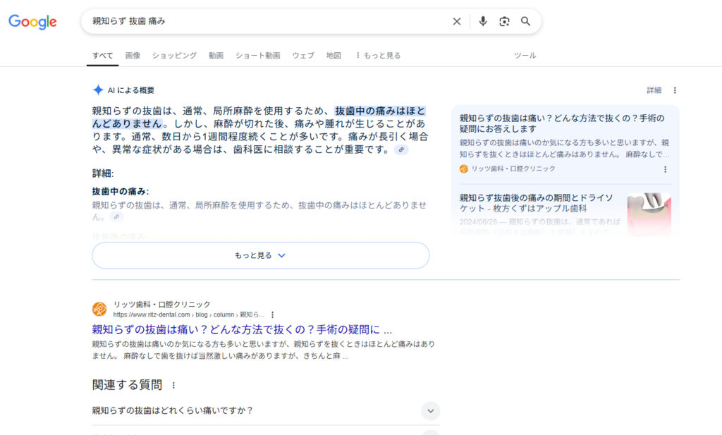 たとえば、「親知らず 抜歯 痛み」と検索した場合、クリックしなくてもページ上で必要な情報が完結してしまうケースが増えています。