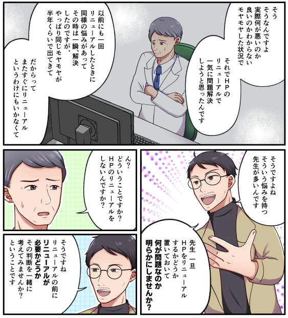 一度作っただけで「目的」を達成できる魔法のサイトなど、この世には存在しません。改善に改善を重ね、時代や競合、そして先生の医院の進化に合わせて成長させていく。その泥臭い「運用」というプロセスこそが、私たちの考えるWebマーケティングの正解(HOW)です。